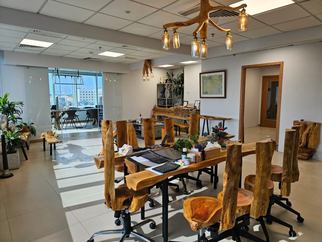 • And to add character—chandeliers and fountains, crafted from the same reclaimed wood