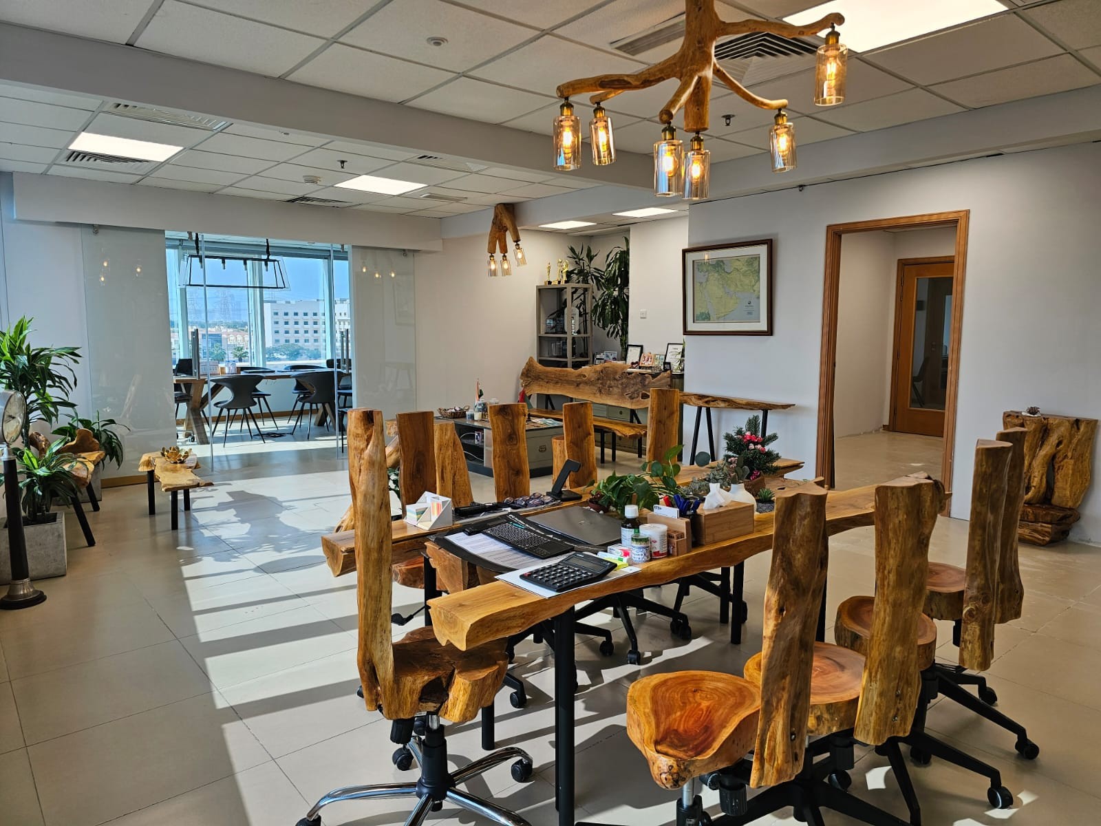 • And to add character—chandeliers and fountains, crafted from the same reclaimed wood