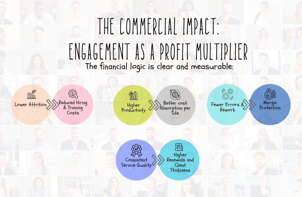 In this environment, disengagement shows up fast: absenteeism, quality slippage, rework, client complaints, and attrition. Conversely, engagement multiplies productivity, stabilizes costs, and elevates client trust.